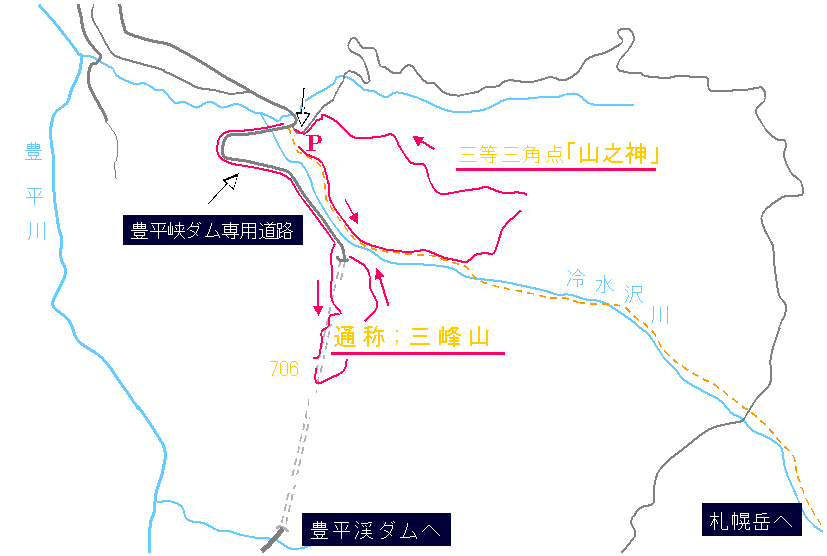 Ikkoさんに誘われ、札幌150峰のうち札幌岳登山口付近の三等三角点「山之神」714.6mと706m標高点(通称;三峰山)に登ってみたが、それなりに厳しく、藪山登山としても十分に楽しむことができた。