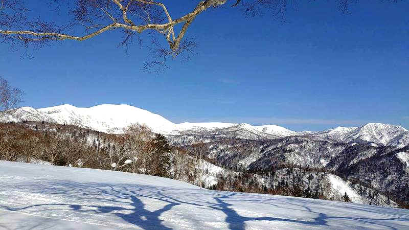 取り付きからすでに体は重かった。 それでも雪の上に立つ感覚は悪くない。 林道が交差する地点までは歩いて登る。 地図では林道を左へ進むと、等高線の緩いところがある。 あとは緩い登高で、あっさりと山鳥峰へ。 定天をはじめ、ヒクタ峰、白井岳、余市岳の眺めが良い。 南岳も難なく到着する。 途中、今シーズン初めての滑り。いけると思った次の瞬間、前のめりにてっ転んだ。 まあ、こんなものだろう。 かつて私が40代の頃、68歳の人を連れて山に行ったことがある。 今、私は69歳。