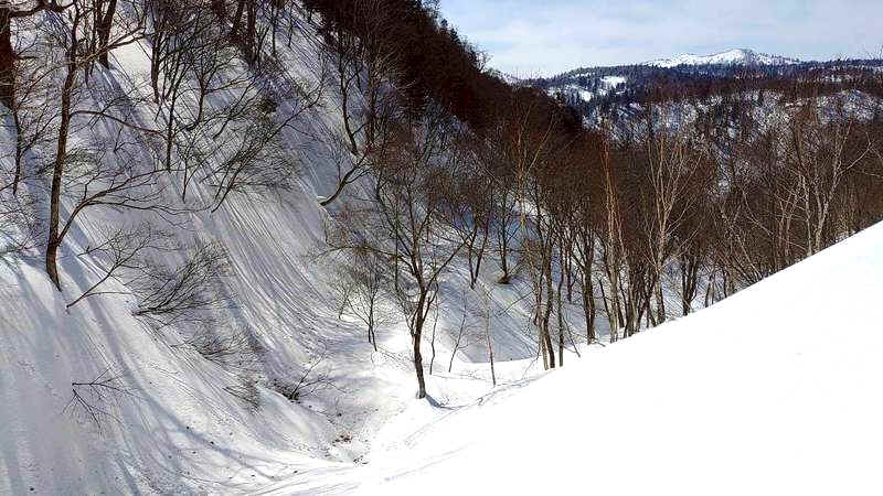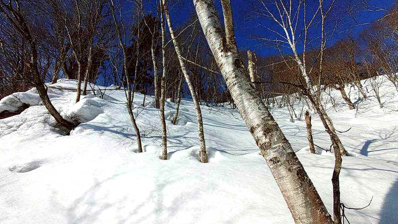 南岳からの帰路。 スキーツアーでは、コブをどう巻くかがルートファインディングの腕の見せ所になる。 この日も、小谷が行く手を阻んだ。 地図を見ると、この急斜面を下れば、多少遠回りにはなるが、登りで通過した林道に出る。 私は迷わず、そのまま下ることを提案した。 最後は沢形に入るが、全層雪崩が起こる状態ではない。 すると、いきなり腰まで埋まる。 さすがに判断ミスだ。 両手に持っていたスキーで体を支え、何とか脱出する。 飛び出した林道は、最初から登りだった。 やがてそれは山の斜面と同化し、急傾斜のトラバースへと変わっていく。 日陰の雪面はカリカリに締まり、踏み込んでも足裏を受け止める余裕はない。 それでも、地図の上には確かに存在している。 木々の切れ間を目指して、さらに登る。 足は重く、呼吸も乱れる。 ようやく道らしきものが現れるが、そこから先もなお緩やかな登りが続いていた。 だが、どんなに続く登りであっても、永遠に続くわけではない。 この日の山行を振り返る。 途中、巻きを試みたが、うまく繋がらなかった。 だが、私はそれをぜんぜん失敗だとは思わなかった。 山に、正しいルートなど存在しない。 だからこそ、山の面白さは、決められた道をなぞることではなく、 このとき私は、無理に巻きを続けるのではなく、そのまま下る判断をした。 結果として、長い林道歩きとなった。 単調ともいえる道だったが、不思議と退屈はしなかった。 地図の上では意識することのなかった風景が、次々と現れてくる。 むしろ、こうした“予定外”のほうが、山の奥行きを感じさせてくれることもある。 「知らないところの方が、わくわくして楽しいものですよ」