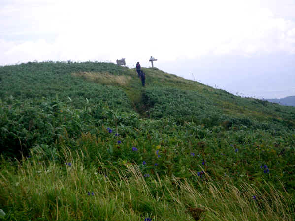 マチネシリの頂上は草原の中の丘と行った感じで見晴らしが良い。この時期、ミヤマリンドウやトリカブトなどの青い花々が美しく、夏尾根登山の疲れを癒してくれる。前線の通過による強風も今年の暑い夏では心地よささえ感じられる。次は本峰・ピンネシリだ。大きな木々がないためスケールが判らずに遠く感じたが、登りに入ると意外に容易である。例によって細かな階段も現われるが、見通しの良さからか開放感も感じられてそんなに苦にはならない。頂上と思われる高みはすぐそこに見える。ただ、あるはずの気象レーダーが現われない。ひと登りして、高みに飛び出すと三角点や看板、頂上からのパノラマを説明する大きな展望案内板のある頂上となる。さすがに眺望は360°である。気象レーダーは反対側の少し下がったところに建てられていた。建物へと降りて行くと舗装道路がここまで登ってきていた。結局、この日のピンネシリへの登山者は我々3名だけであった。有名どころと思われたこの山が意外に不人気なのには驚く。同程度の登山時間で登れる札幌の砥石山も私は登山が中止となった雨の日などに訪れることにしているが、それでも訪れる登山者は必ず何組かはいるものである。この山に関しては少々遠いので、何かの時の代替案としては手軽ではないのかもしれない。